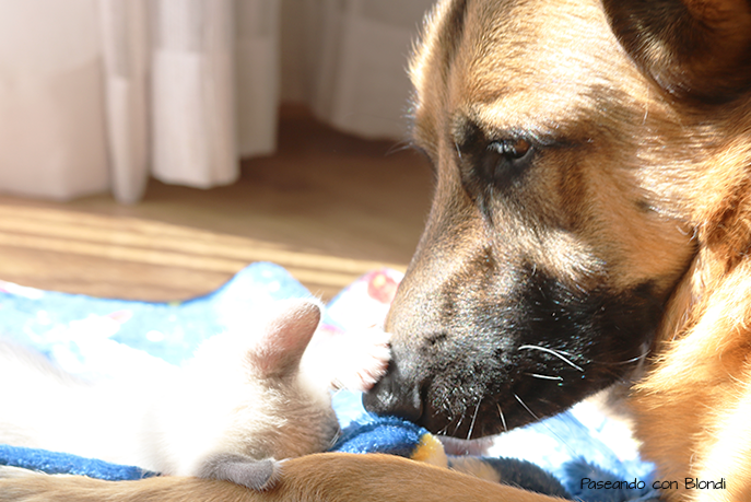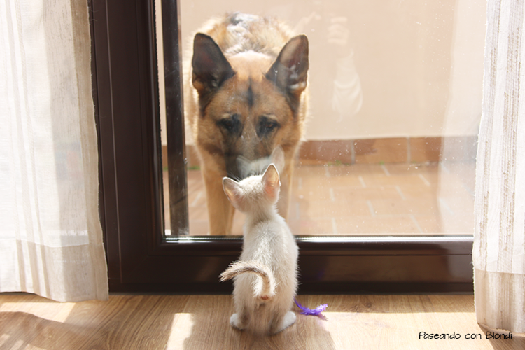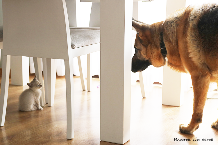 Y nos es para menos porque Blondi en la calle persigue gatos y nunca antes había convivido con uno.