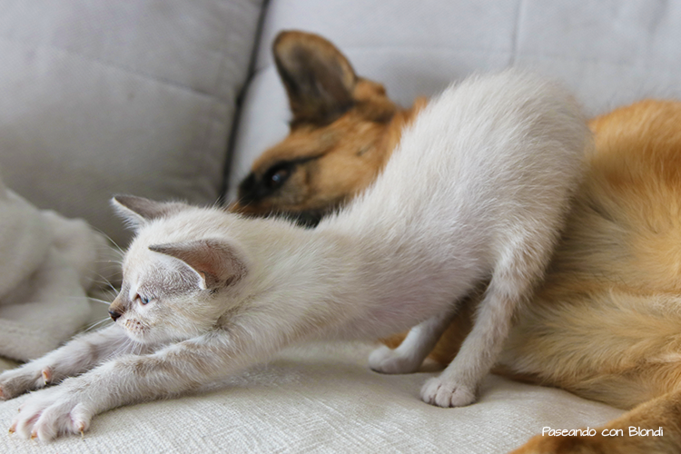 Blue busca a Blondi siempre para dormir, juegan juntas, comparten comida cuando yo no me doy cuenta y lían alguna que otra travesura. Sin embargo, es increíble verlas juntas, tanto que desde hace días que no enciendo ni la televisión, me dedico a mirar cómo interactúan o cómo duermen juntas.
