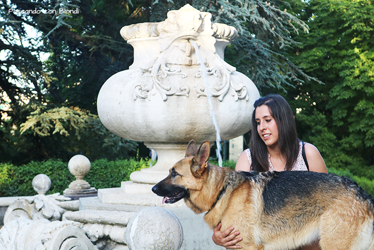 El calor de las últimas semanas es insoportable y claro, nuestras rutinas tienen que cambiar porque no podemos estar tanto tiempo en la calle, por eso hoy hemos elegido este parque de Madrid para dar el paseo y donde además Blondi se puede refrescar.